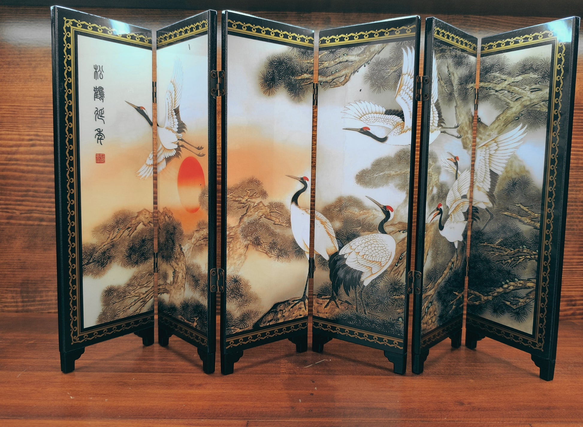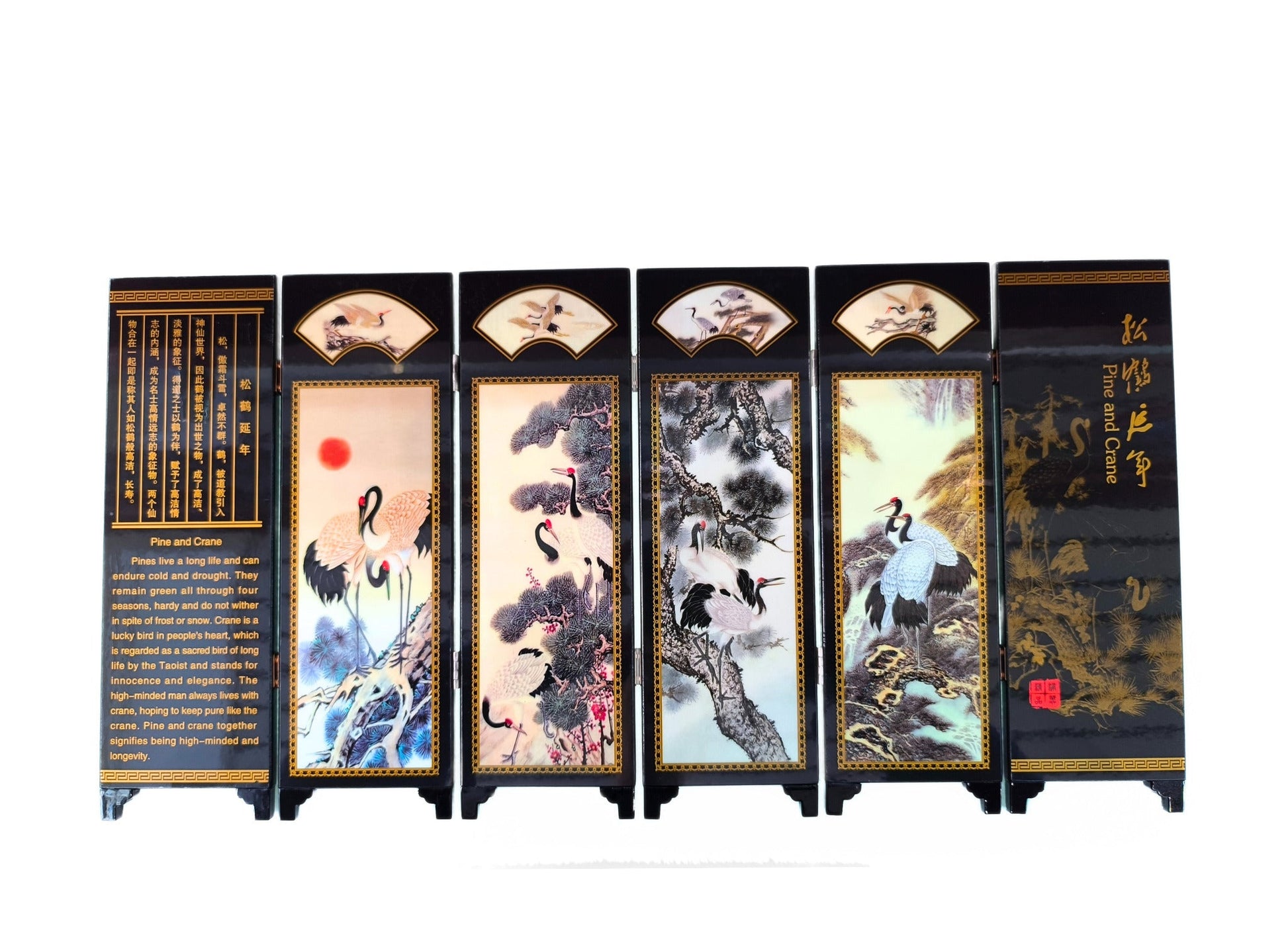 Ce mini-paravent illustre une famille de grues évoluant en harmonie, un hommage à l’unité et à l’amour durable. Dans la peinture traditionnelle, leur vol exprime l’élévation de l’âme et la sagesse tranquille.